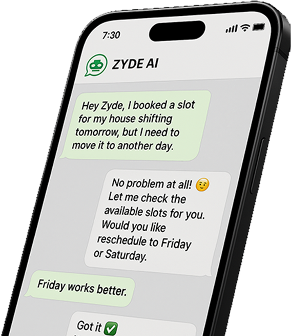 Every unanswered call is lost revenue. Zyde answers instantly 24/7 — booking cleanings, moving slots, or repair visits while you focus on running operations.